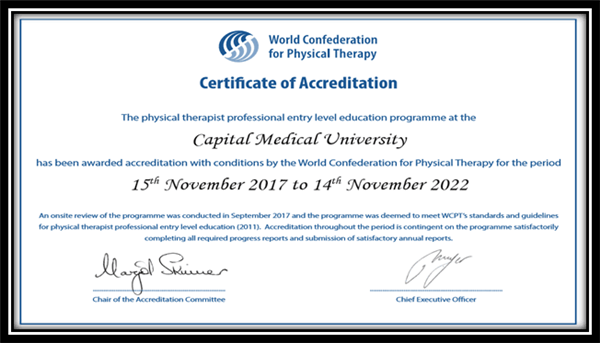2017年12月1日,首都医科大学康复医学院(365体育投注官方网站)康复治疗学物理疗法专业课程顺利获得世界物理治疗联盟(WCPT)五年期权威国际教育认证。2017年 9月,WCPT国际教育认证专家先后对首都医科大学校本部、康复医学院、物理治疗教研室进行了现场考察和评估,迎评会上,王松龄副校长和李建军院长、物理治疗教研室等分别代表校本部和康复医学院就学校整体情况和PT课程总体设置进行了详实的汇报。经过两天紧张有序的现场评估考察,两位专家对康复医学院PT专业建设的整体情况和取得的成绩给予了充分肯定和极高评价,同时提出了很多国际化先进教育理念和相关建设性意见。12月1日首都医科大学康复医学院(365体育投注官方网站)物理治疗专业成功获得WCPT国际教育认证。经过多年不懈努力,首都医科大学康复医学院、365体育投注官方网站PT、OT、P&O三项康复治疗学专业课程全部得到了国际认证,成为中国第一个获得三项康复治疗课程国际认证并与国际接轨的康复医学院。